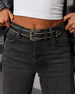 The Ashwyn Studded Western Belt is your not-so-subtle nod to the modern cowgirl, bold, effortless, and just the right amount of edge. Featuring luxe leather texture with all-over studded trim and a vintage-inspired etched buckle, this statement piece turns even the simplest jeans-and-tee combo into an intentional outfit. Whether you're headed to a rooftop hangout or an indie concert downtown, this belt says you're not just showing up, you’re arriving.