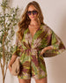 Meet your one-and-done ticket to tropical chic: the Brinklie Kimono Sleeve Romper. Designed to turn heads from beachside cocktails to sunset strolls, this statement piece features a vibrant tropical print on breezy crepe fabric that feels as good as it looks. The flowy kimono sleeves add an effortless elegance, while the open back with an attached tie detail brings a sultry twist to your vacay vibe.