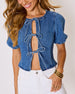 The Delilah Denim Tie Front Top is the main character energy your closet’s been waiting for. With a flirty tie-front silhouette and puff sleeves that bring just the right amount of drama, this top takes denim from casual to standout in a snap. The structured fabric holds its shape while still feeling light enough for rooftop hangs or late-summer strolls.