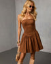 Enter the Eastport Suede Fit and Flare Mini Dress, a smooth suede beauty with a strapless neckline that stays perfectly in place thanks to its clever silicone trim. The structured fit-and-flare silhouette highlights your waist while the pleated skirt adds a touch of playful movement. Whether you’re toasting at a rooftop bar or dancing under city lights, this dress is your go-to for effortless sophistication with a wink of bold charm. Step in, stand out, and let the night begin.
