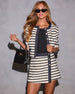 From desk to drinks, this Ellah Contrast Striped Jacket has range, and a whole lot of personality. Bold stripes meet padded shoulders for a structured silhouette, while denim trim and etched buttons bring a touch of unexpected edge. It’s giving polished with a wink, thanks to the faux pocket detailing and subtle vintage vibes. Throw it over a tee for weekday errands or pair it with the matching Ellah Mini Skort for a look that says “I have plans.”