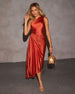 Look chic at your next formal gathering with the Modern Day Glam Satin Pleated One Shoulder Cutout Asymmetrical Maxi Dress. Its pleated design and asymmetrical hem make such a bold statement!