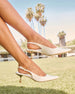 Statement heels, meet your summer muse. The Pavilion Leather Slingback Heels bring sleek sophistication with a hint of glam—perfect for golden hour moments and chic rooftop dinners. Designed in smooth faux leather, this pointed-toe silhouette is all about clean lines and standout details. The adjustable slingback buckle keeps the fit just right, while the reflective gold-tone heel delivers that subtle wow factor with every step.