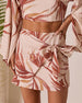 The Ramiah Wrap Tropical Mini Skirt is your go-to for that sun-kissed, endless summer vibe. Draped in soft crepe jersey, this mini boasts a lush palm leaf print that whispers tropical getaway dreams. The attached wrap tie accent adds just the right touch of flirty sophistication, letting you cinch your waist for a silhouette that’s all about ease and elegance. Pair it with the matching Ramiah Tropical Crop Top for a look that’s effortlessly chic and perfectly moody.