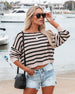 Perfect for a light breeze, the Sidelines Cotton Striped Knit Pullover in taupe and black stripes features a wide neckline.
