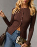 Whether it’s a casual coffee run or a weekend gallery stroll, the St. James Ribbed Buttoned Top would be your new go-to for looking effortlessly chic. This stretch-fit ribbed knit jersey hugs just right while the front buttons add a touch of polished ease. The playful flyaway hem gives every outfit a hint of effortless movement, perfect for pairing with everything from tailored trousers to your favorite jeans.