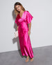 Be the hostess with the most style or best-dressed guest wearing the Theia Satin V-Neck Maxi Dress. It features a V-neckline, draped kimono short sleeves, and a stunning, thigh-high side slit. This shiny, satin fabric is so elegant! Finish off this glamorous look with shiny gold or silver accessories.