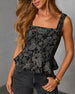 The Wanderlune Printed Peplum Top brings serious seasonal charm with a structured twill silhouette and a dreamy square neckline that frames just right. The rigid, non-stretch fabric gives it a polished feel, while the smocked back panel keeps things comfortable and fitted. The peplum hem adds a soft flounce that moves with you, whether you're layering it under the matching shirt jacket or styling it solo with the mini skirt or high-rise denim.